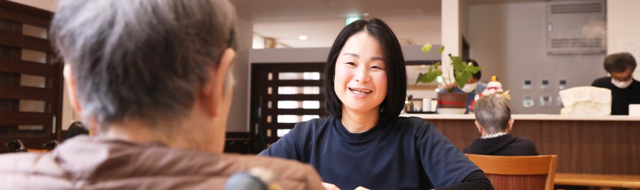 - 利用者様との距離が近く、アットホームなところが働きやすく、やりがいを感じます。私は昼間勤務なので、自分の子どもより利用者様と接する機会が多いです。すると利用者様の表情や声を聞くだけで、ちょっとした変化が分かるようにもなりますし、本当に家族と思えるぐらいの近さで、利用者様もそう思っていただいていると思います。また、職員同士助け合いながら働けているので、そういった面でも心強いです。私たち子育て世代は、学校からの呼び出しや、子どもの風邪といった急を要するケースも多々あります。そういった場合、現場の人数が少ないにも関わらず「行っておいで」と送り出してくれますし、「お互い様」という心遣いがすごくありがたいです。