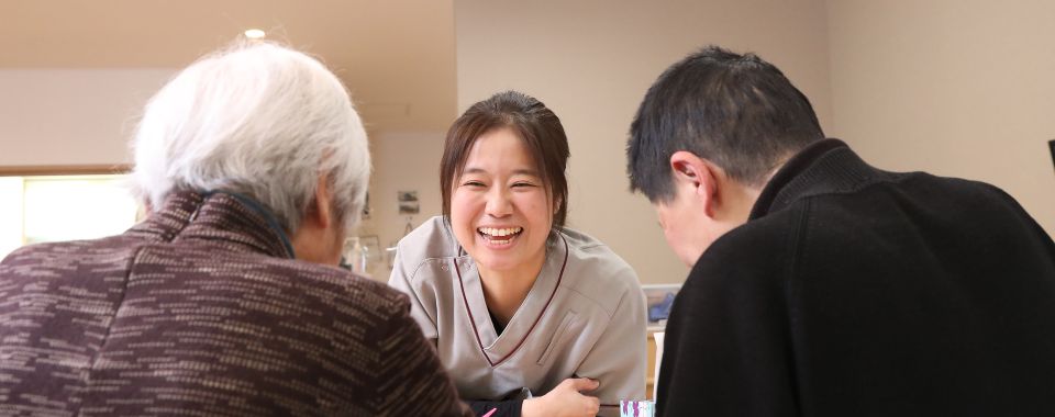 - デイサービスにおいて、介護スタッフとして利用者様の生活介助を行っています。 食事、排せつ、入浴の介助などの主な仕事のほか、利用者様の送迎やレクリエーション活動も行っています。季節の行事や制作、すごろくや言葉集めゲームといった、みんなで盛り上がるようなレクリエーションの内容を決めるのも仕事の一つ。スタッフが意見を出し合って相談しながら、利用者様に楽しんでもらえるようなレクリエーションを考えています。 そして介護の場面について気をつけているのは、以前働いていた特別養護老人ホームとは違い、デイサービスは介護度が低い方が多くいらっしゃるので、介助の程度を意識すること。自立支援介護を意識し、ご自分でできることはやっていただけるよう、お手伝いをしすぎない介助を心がけています。