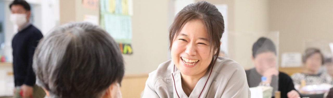 - 元々「かしまの杜」の方で勤務しており、「すがの杜」には1カ月前に異動してきたばかりです。まずは利用者様お一人おひとりのお顔とお名前、お好きなことなどを覚えて、その方にとってベストなサービスを提供することが当面の目標です。個々の利用者様に合った介助方法や声かけを行うことで、一日でも早く信頼関係を築いていきたいと思います。 また、子育てもようやく落ち着いてきたので、今後は勤務の時間を増やしながら、仕事の比重を少しずつ増やしたいと考えているところです。子育て中のときはたくさんサポートをしていただいたので、今後は自分がさまざまな場面で周りのスタッフに頼ってもらえるような存在を目指していきたいです。