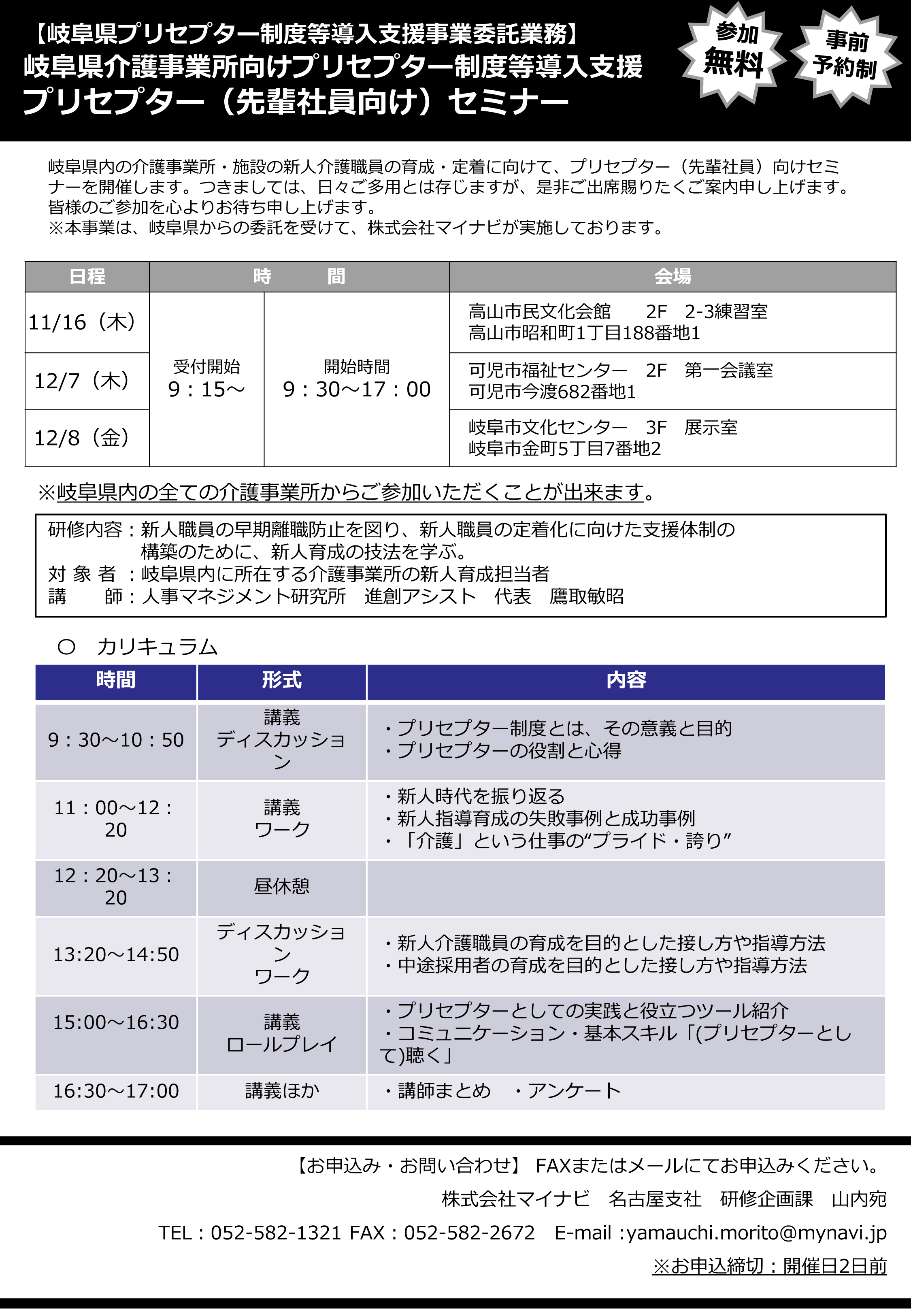 岐阜県内の介護事業所・施設の新人介護職員の育成・定着に向けて、プリセプター(先輩社員)向けセミナーを開催します。参加費は無料ですので、ぜひご参加ください。