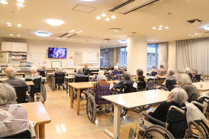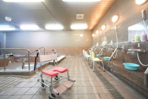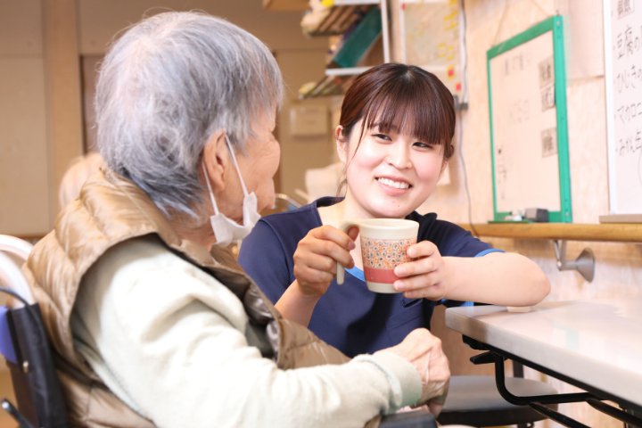 - 介護ネイル、マッサージ、自分の家のペット面会、五平餅実演など、スタッフの「やってみたい」という意見は前向きに取り入れています。SNSでも日常の出来事やイベント、施設の情報を積極的に発信しています。デイケアの入浴浴槽は温泉施設の大浴場のように広く、利用者に喜んでいただいています。デイケアで毎日30名、施設利用者で約100名の入浴介助を、広々とした浴室でできる環境が整っています。また、癒やし犬・トイプードルのなぎくん(2歳)も不定期で出勤し、フロアやデイの利用者、職員を癒やしています。みんなに可愛がられる、人懐っこい性格です。