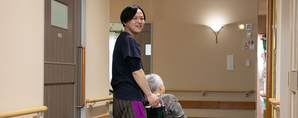 - 主に利用者様の食事や排せつ、入浴、離床、着床など日常生活の介助を行っています。入職してすぐの頃は、排せつの介助などこれまでの仕事からは想像もつかないような業務ばかりで、衝撃を受けることもありました。しかし毎日続けていると、いつしかすべてが日常生活の一場面であり、あたり前のことと思えるようになりました。少しでも利用者様に気持ちよく過ごしていただきたいと、自分なりに工夫するようにもなりました。