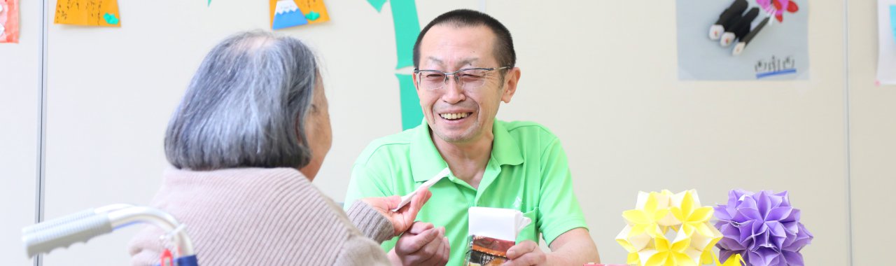 - 現在は係長という役職で、施設全般を統括しながら見守っている立場です。新人育成や職員の人事評価なども担っています。食事、入浴、排せつの介助といった業務も行い、スタッフと一緒に利用者様の生活のお世話をすることも。初めて入所された方に対しては、自分の名前や立場を言わないでおくことをポリシーとしています。自分が何者であるか、どういった人物であるかということを利用者様ご自身に考えてもらい、そのうえで知ってもらいたいからです。まずは人として興味を持ってもらうことで、利用者様との距離を縮めたいと考えています。
