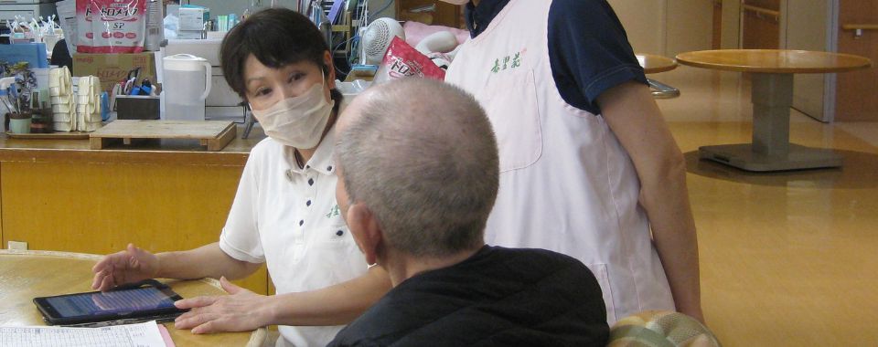 - 介護保険制度が始まった2000年頃、介護職に興味を持つようになりました。当時、ヘルパー2級の実習で春里苑を訪れた際、指導していただいた職員の方の熱心な説明に心を動かされたのがきっかけです。「ここで働きたい」と強く思いましたが、当時は介護職の募集がなく、事務員のパートとして働くことになりました。24年間にわたって事務職を経験してきましたが、定年が近づいてきたタイミングで、やはり介護の仕事がしたいと施設長に相談し、約1年前から介護職員として働き始めました。