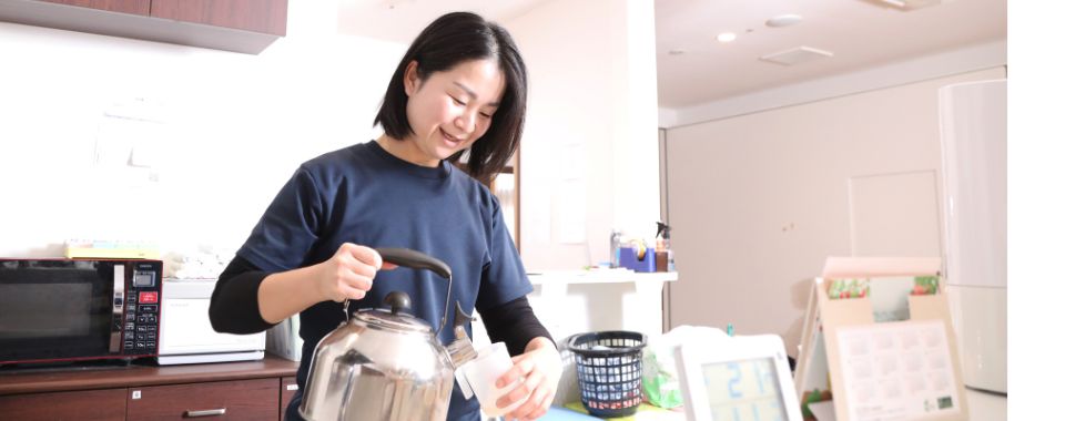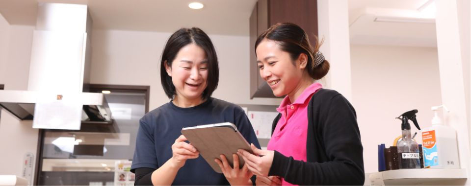 - 利用者様との距離が近く、アットホームなところが働きやすく、やりがいを感じます。私は昼間勤務なので、自分の子どもより利用者様と接する機会が多いです。すると利用者様の表情や声を聞くだけで、ちょっとした変化が分かるようにもなりますし、本当に家族と思えるぐらいの近さで、利用者様もそう思っていただいていると思います。また、職員同士助け合いながら働けているので、そういった面でも心強いです。私たち子育て世代は、学校からの呼び出しや、子どもの風邪といった急を要するケースも多々あります。そういった場合、現場の人数が少ないにも関わらず「行っておいで」と送り出してくれますし、「お互い様」という心遣いがすごくありがたいです。